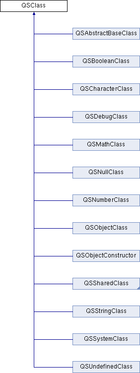 Reimplementado en QSArrayClass, QSObjectClass, QSBooleanClass, QSNumberClass, QSStringClass, QSClassClass, QSFunctionScopeClass, QSEvalScopeClass, QSDateClass, QSErrorClass, QSFuncRefClass, QSRegExpClass, QSByteArrayClass, QSColorClass, QSPaletteClass, QSColorGroupClass, QSPointClass, QSSizeClass, QSRectClass, QSFontClass, QSObjectConstructor, QSVariantClass y QSPixmapClass.